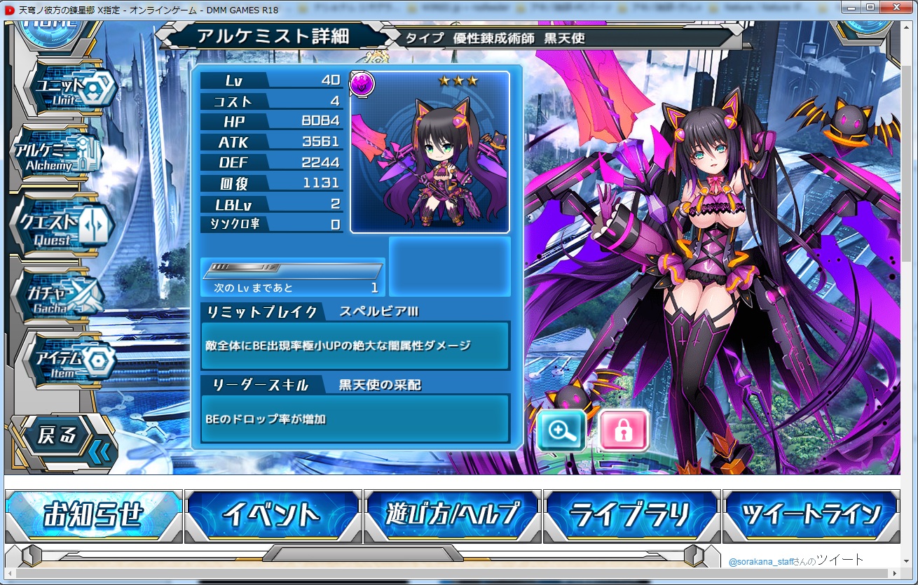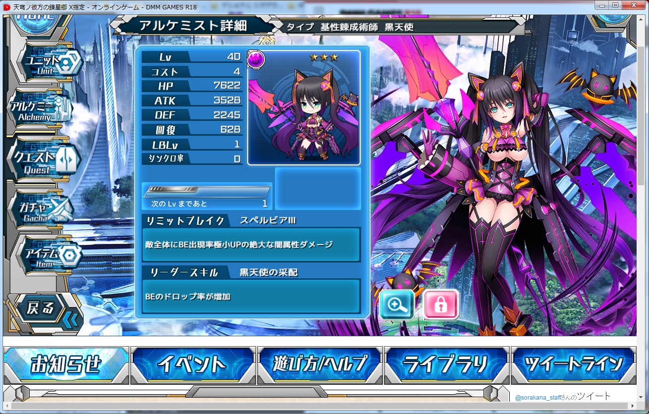 やっと黒天使入手できる機会ができた。ツイート的にこれ今日のメンテでくるとおもうからすげえ楽しみ 最近マンネリ化してた闇PTに闇キャラ新しいの使えると思うとうれしい --
